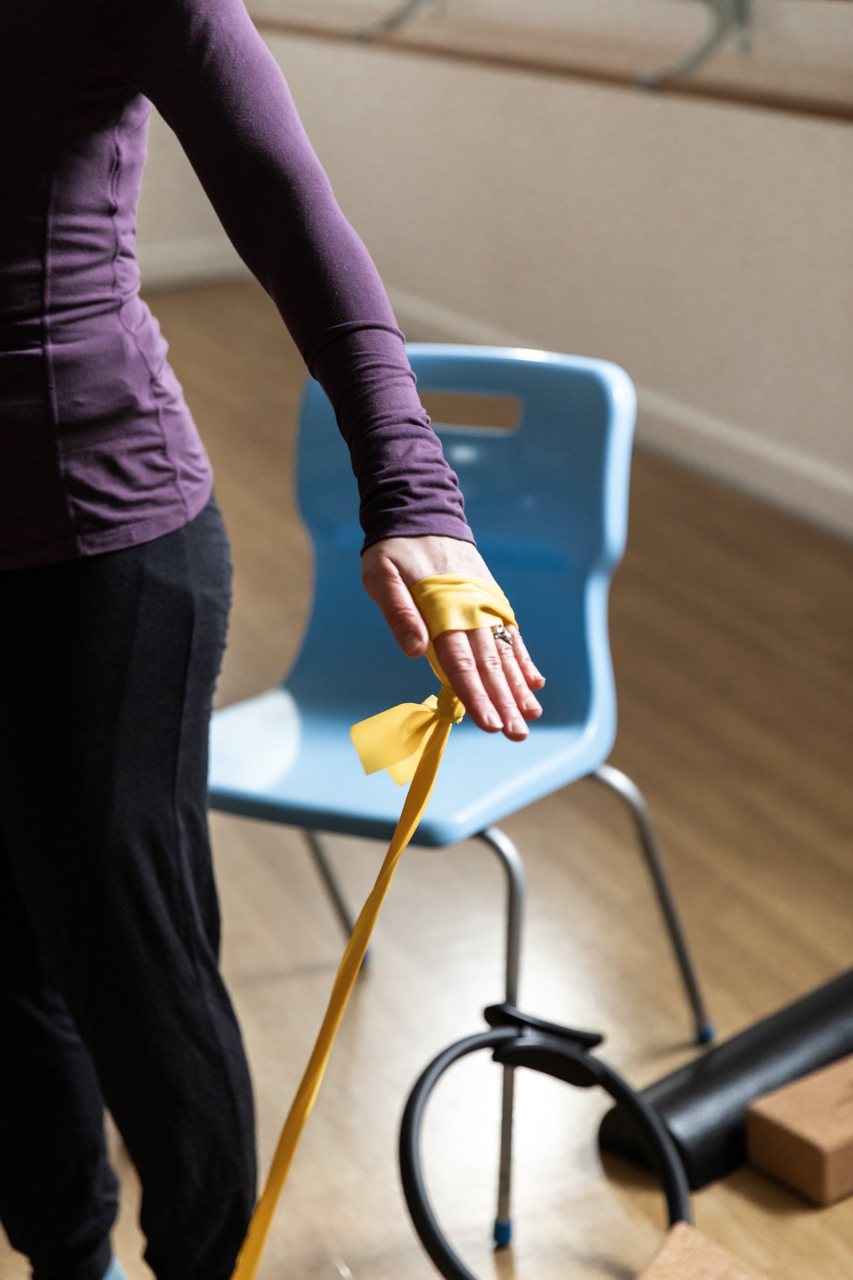 We incorporate small fitness props, such as resistance bands and therapy massage balls into the class for movement diversity.